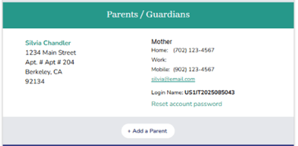 🔘 + Add a Parent: Use this button to add another parent/guardian. The instructions for adding a parent/guardian are nearly identical as those found in Create a new family account.
