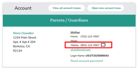 - When your account is created or updated, and you have opted in to SMS, your details appear on the Parents/Guardians account page.
