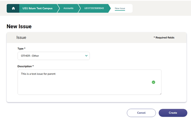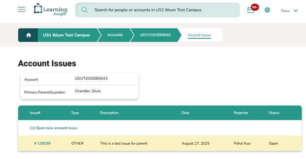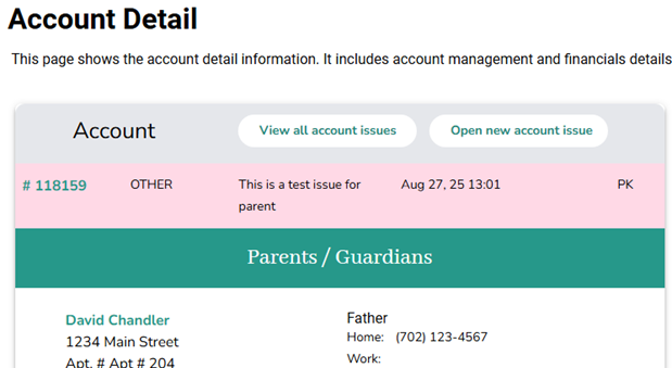 View all account issues: The administrator can view all current and past account issues related to this parent by clicking on the button.