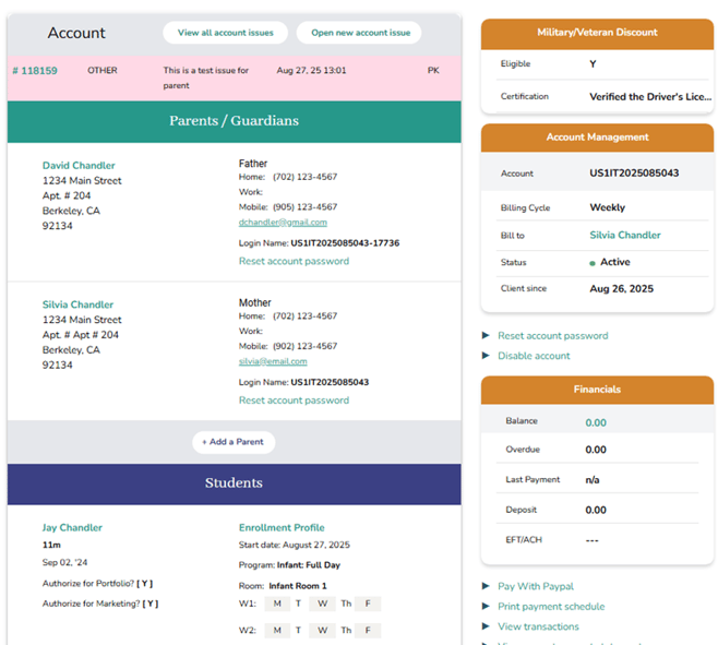 This document explains each part of the Account Detail Page and how to use it for managing parents/guardians, students, and financials.