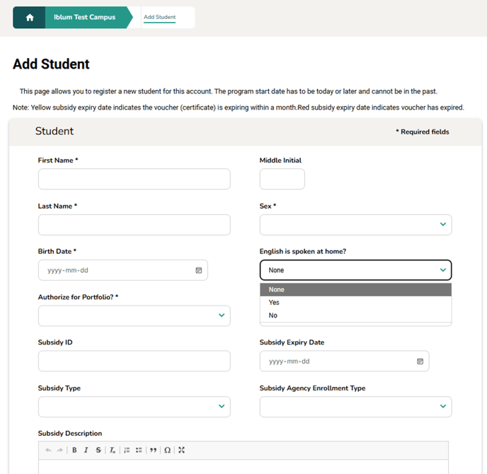 - English is spoken at home? – This field defaults to “None” if the person entering the data is unaware of the main language spoken at home. If English is a second language spoken, enter No, otherwise Yes for those families where English is the main language.