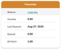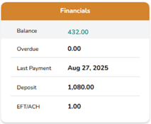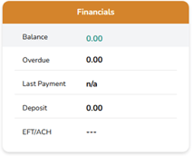 The Financials panel shows balances and payments: