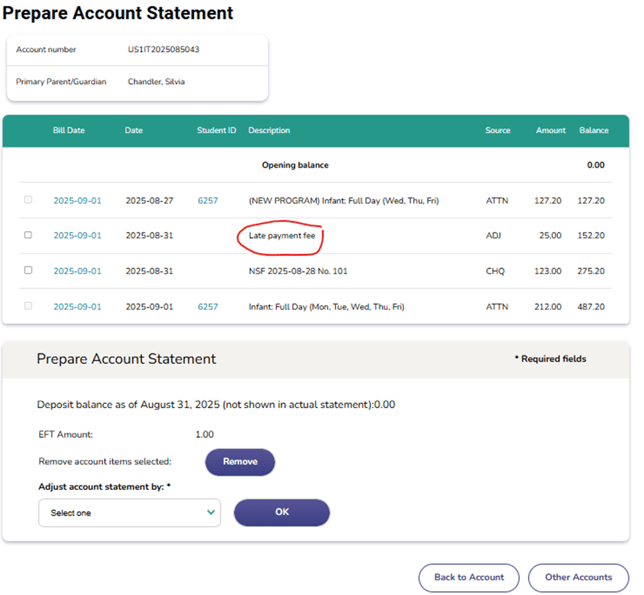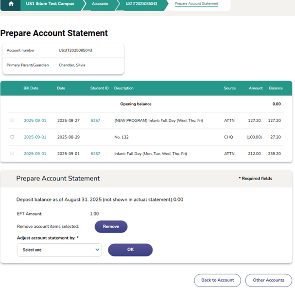 - If you selected to add more miscellaneous charges to this account, it returns to this screen. Otherwise, it will bring you back to the Prepare Account Statement page.