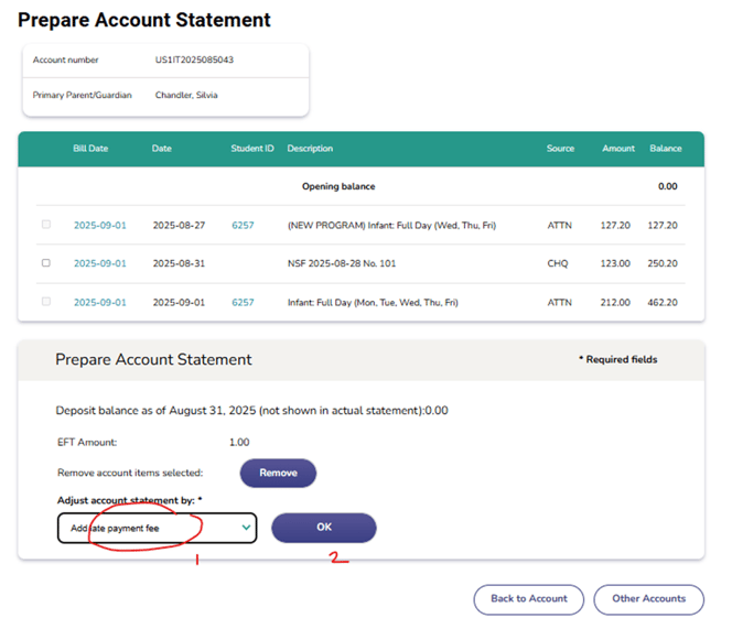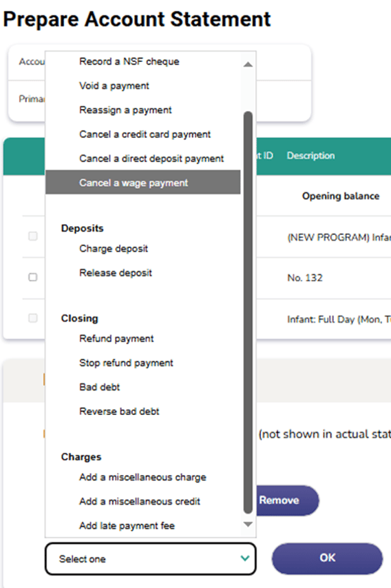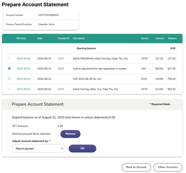 - Once a cheque is selected, click the Continue button to record the fee adjustment to the account. This will also bring you back to the Prepare Account Statement page.