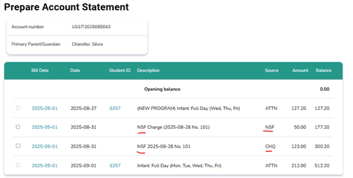 - 2025-09-01 – ATTN charge – This charge is an automated billing charge for upcoming week for the child – Sep 1, 2, 3, 4, 5.