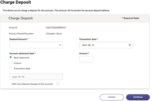 Use this to record when a deposit is charged to the account.- The deposit charge can be applied to a student or the account. Using the Student/Account drop down box, select the student/account of the primary parent that the deposit charge will be applied to.