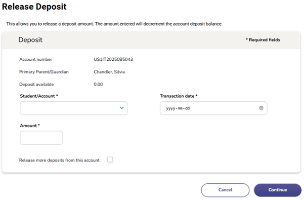 Select this to release a previously charged deposit back to the account.- Deposits released can be applied to a student or the account. Using the Student/Account drop down box, select the student/account of the primary parent that the deposit release will be applied to.