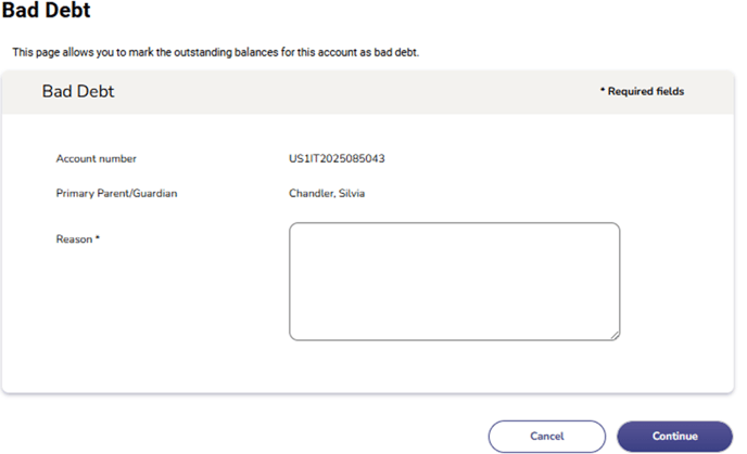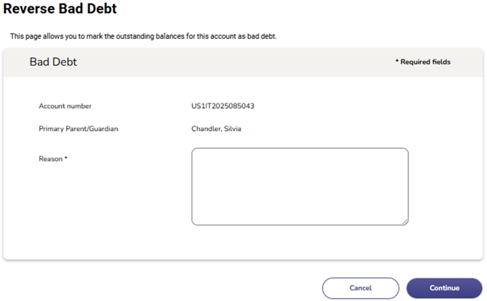 Use this if a previously marked bad debt is later collected or needs correction or to activate an account for a returning parent.- Select the reverse bad debt option from the Prepare Account statement page.