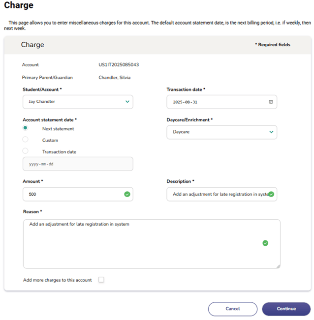 Record any extra charge not covered by standard categories (e.g., supplies, late pickup fee).- The miscellaneous charge can be applied to a student or the account. Using the Student/Account drop down box, select the student/account of the primary parent that the miscellaneous charge will be applied to.