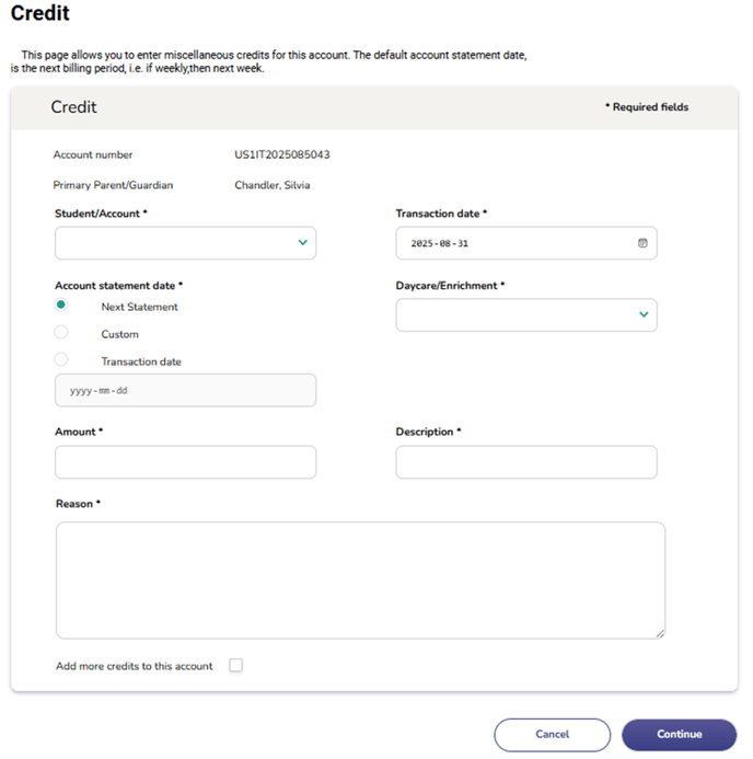 Apply a credit to the account outside of regular payments (e.g., goodwill adjustment).- The miscellaneous credit can be applied to a student or the account. Using the Student/Account drop down box, select the student/account of the primary parent that the miscellaneous credit will be applied to.