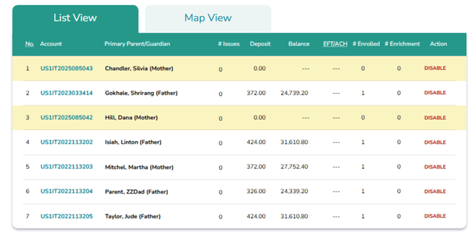 - Yellow Row → The account has 0 students enrolled and can be disabled.