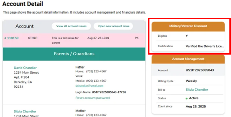 The Military/Veteran Discount applies only to the primary parent and appears on the Account Detail page once verified.