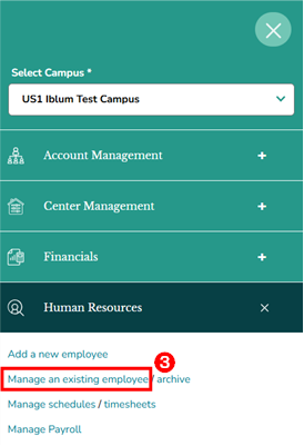 - First access the Human Resources section by clicking on the hamburger menu item. See image above