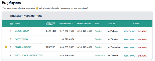 - Role - The employee’s position (e.g., Teacher or Supervisor).