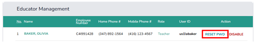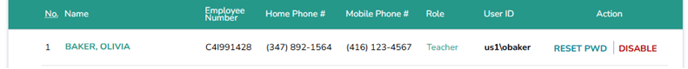 - Action – Available functions based on user role: Reset Password (RESET PWD) and Disable (DISABLE).