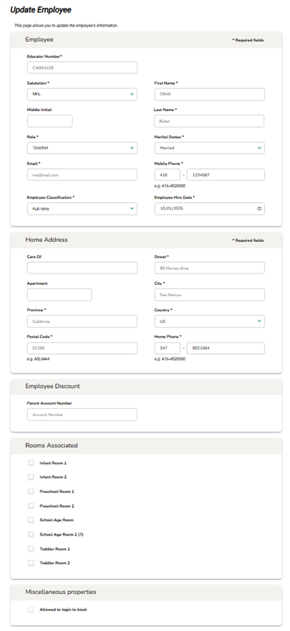 The Update Employee page allows authorized users to update an employee’s information as needed: