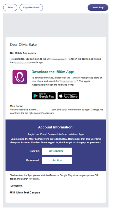 When you click Reset Password (RESET PWD – image above), the system redirects you to the Login Instructions page. From there, you may choose to Print or Copy to Email the login details. Click Next Step to return to the previous page.