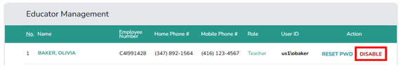 Click Disable (DISABLE – image above) to deactivate the employee’s record. Once deactivated, the record will be transferred to the Disabled Employees page.