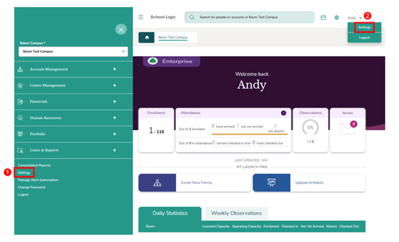 - Another way to access Settings is to click your profile name in the top-right corner, then select Settings (located above Logout).