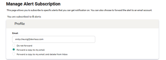 Alerts - This page allows you to subscribe to specific alerts that you can get notification on.