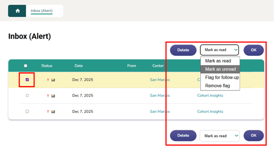 Manage notifications: Select all notifications or specific items, then choose to delete, mark as read or unread, flag for follow-up, or remove flag.