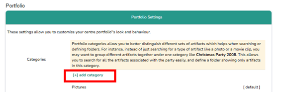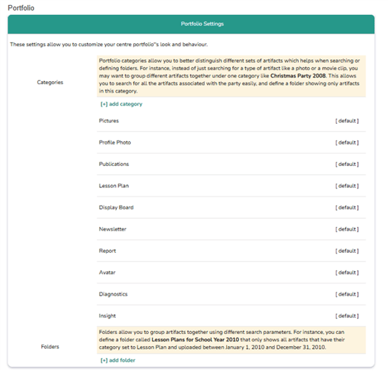 Portfolio - Portfolio settings allow you to customize the look and behaviour of your centre portfolio by organizing artifacts into categories and folders.
