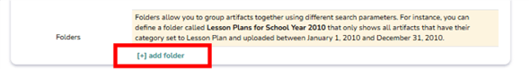 👉 Example: You can define a folder called Lesson Plans for School Year 2010 that only shows all artifacts that have their category set to Lesson Plan and uploaded between January 1, 2010 and December 31, 2010.