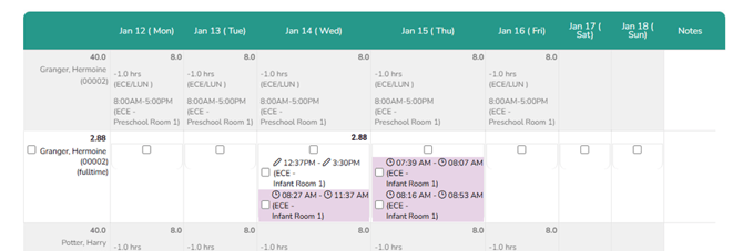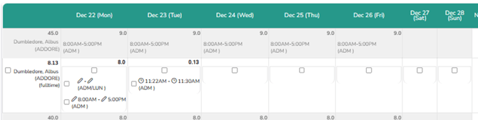 Once submitted, you will be able to see the hours added on top of each cell and as well on top of the employee’s name totaled:
