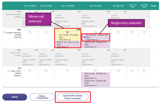 To submit pre-filled work activities, you must have valid kiosk entries on the app. Entries in purple are valid entries that can be submitted.