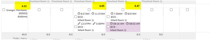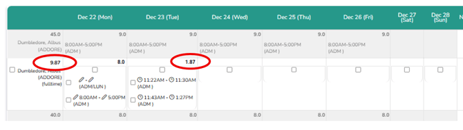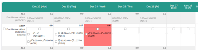 After adding the rest of their shift, it will total up the hours above the employee name and the hours of that day at the top of the cell: