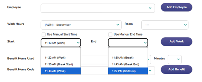 Continue adding the rest of their shift. If they went on break/lunch add the next start time when they finished their break. Below you will see that their break ended at 11:43 marked by (Break End). Therefore 11:43 that will be the next available start time marked with (Work).