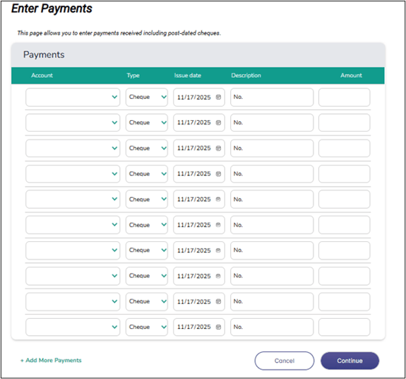 The Enter Payments page allows authorized users to record payments received, including post-dated cheques. This feature helps ensure that all payments are accurately logged and associated with the correct account for the current billing period.