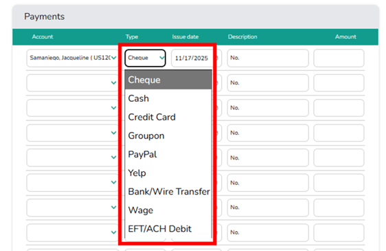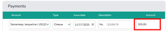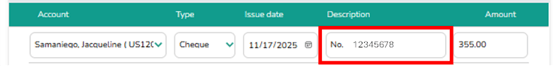 - Description - Add notes or identifiers related to the payment (e.g., Cheque or OR #).