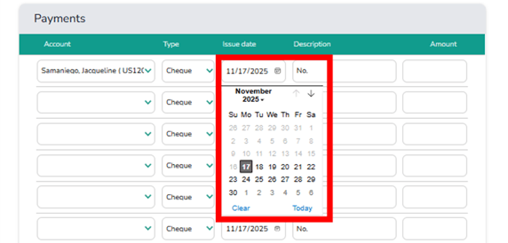 - Issue Date - Enter the cheque or payment issue date using the calendar picker.
