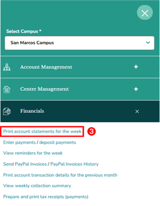 - In the Financials section, click the “Print account statements for the week” link. This will redirect you to the Print Account Statements page.
