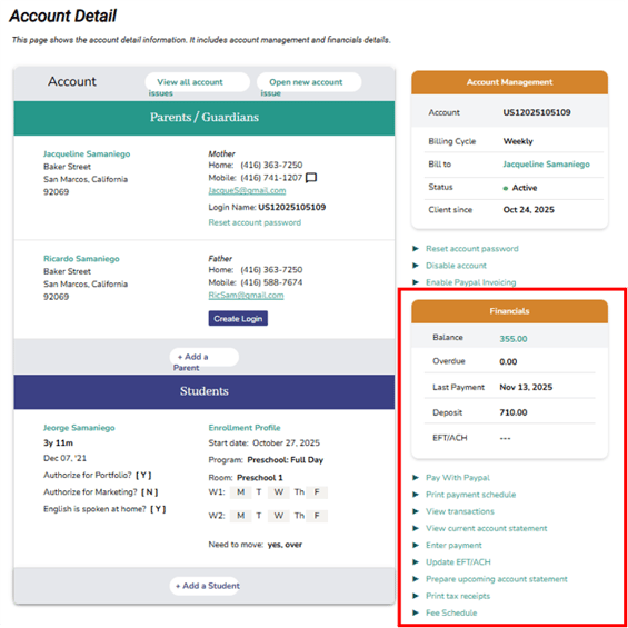 - Account Holder (Primary Parent) Details: name and address