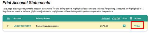 This page displays a list of accounts with key information, including Account Number, Primary Parent Name, Balance forward or Charge difference (if applicable), Print Checkbox, and Action (View).