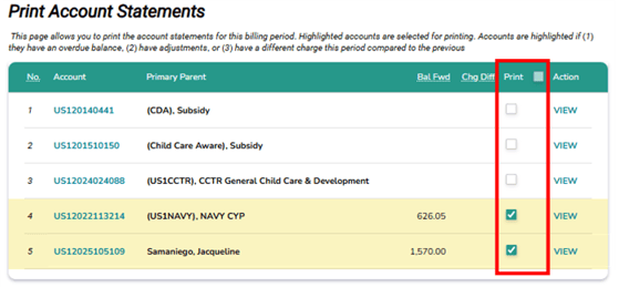 C. Select Accounts for Printing - Under the Print column, select the checkbox next to each account you want to include in the print batch. You may choose individual accounts or use the checkbox in the Print column header to select or deselect ALL available statements.