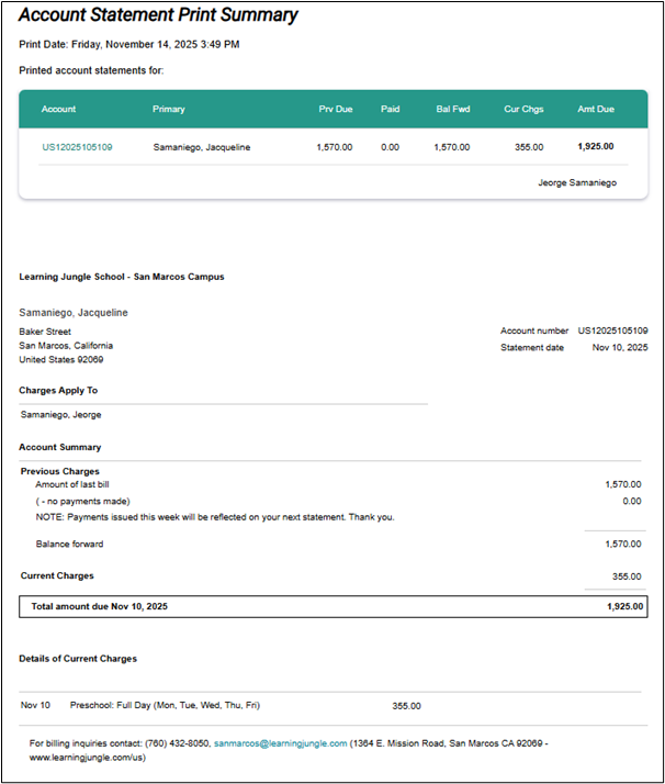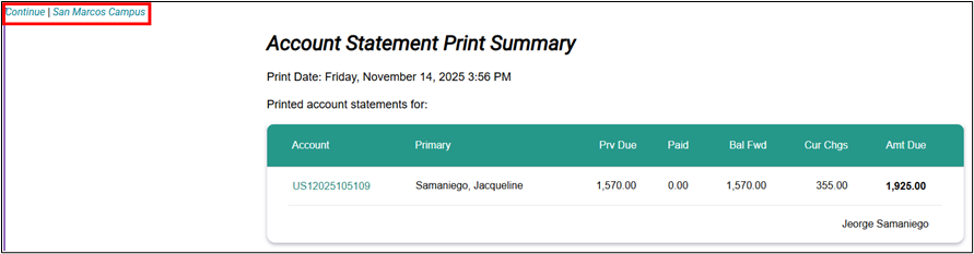 To print an additional statement, click the “Continue” button located at the top-left corner of the page to return to the Print Account Statements page. Alternatively, click the center name (e.g., San Marcos Campus) to navigate back to the dashboard.