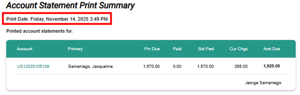 Located at the top of the page, this shows when the statement was generated. Help confirm the statement’s timeliness and ensure you are viewing the latest billing summary.