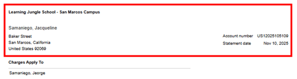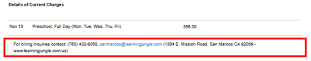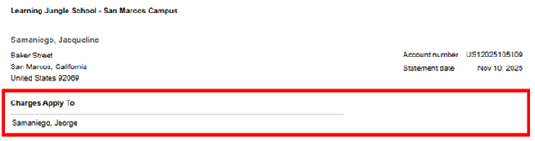 - Charges Apply To: Shows the name of the child or student the charges are attributed to. Useful when multiple dependents are linked to one billing account.