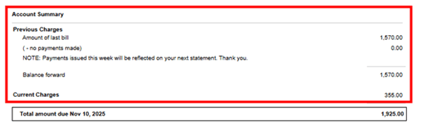 - Total Amount Due - Combined total of all previous balances + current charges.