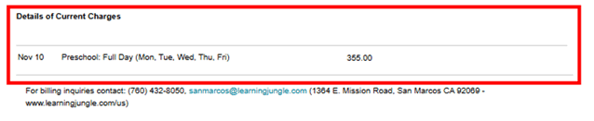 A line-by-line breakdown of what the current charges include. Helps parents verify what they are being billed for.