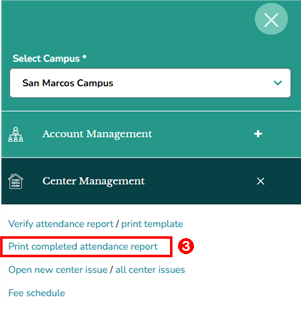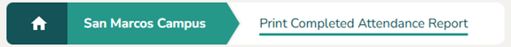 - Breadcrumb (San Marcos Campus > Print Completed Attendance Report): Shows your current location in the portal.