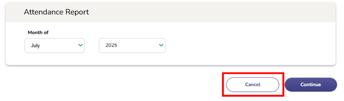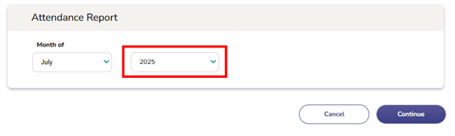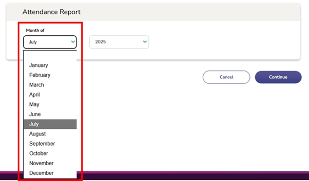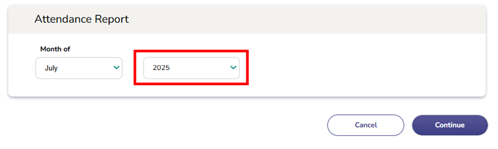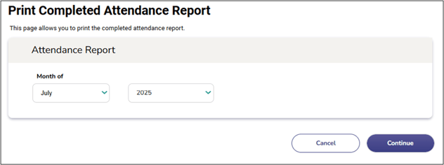 - Continue - Click Continue to proceed after selecting the desired month and year. This will generate the attendance report for printing.