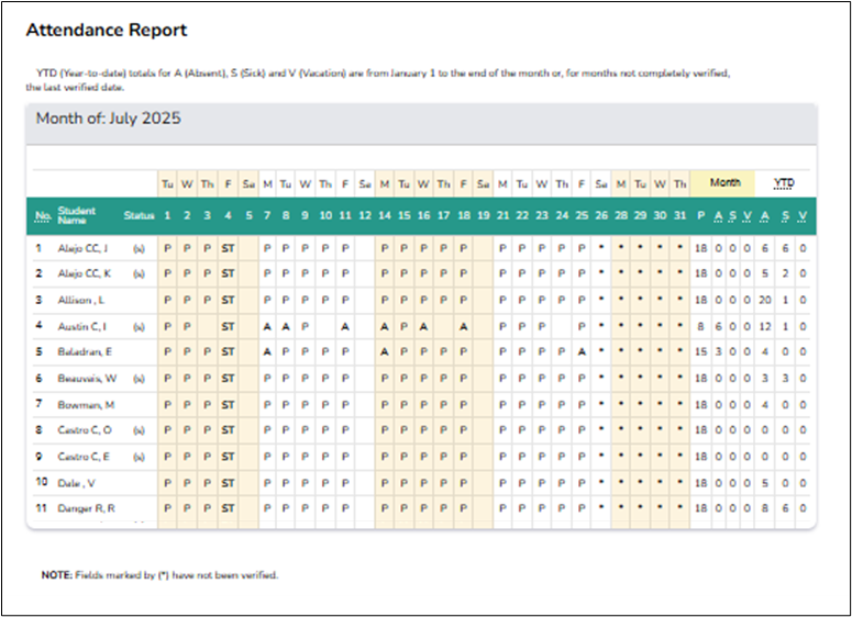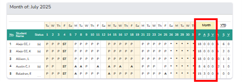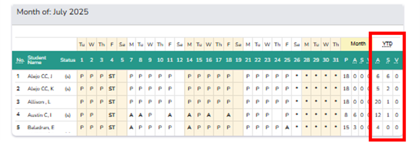 D. YTD Totals – Year-to-date totals of Absent (A), Sick (S), and Vacation (V) from January 1 to the last verified date.