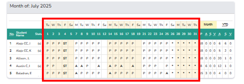 B. Daily Columns – Attendance record for each day of the month (e.g., 1 to 31 for the month of July 2025). Attendance codes: (P) = Present, (A) = Absent, (FD) = Part-day to Full-day, (S) = Sick, (V) = Vacation, (ST) = Statutory Holiday, (E) = Extra Day, (EF) = Extra Day and Part-day to Full Day, (CR) = Center Closure and refund for the day, (CN) Center Closure and No Refund for the day.