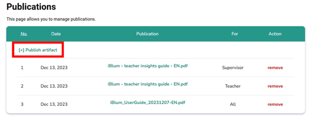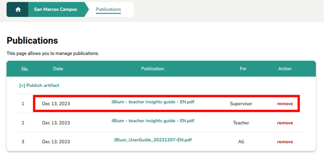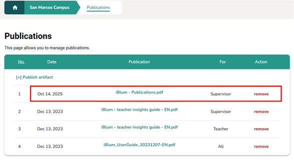 - Once published, the artifact will appear in the Publications list with an option to Remove it at any time.
