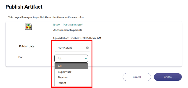 - Choose the publication date and target audience from the drop-down menu (e.g., Supervisor, Parent).