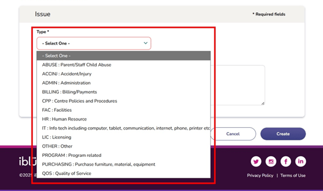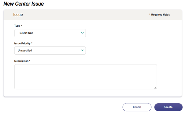Once all required fields are completed, click the Create button to submit the issue. If you do not wish to continue, click Cancel to return to the dashboard without saving.